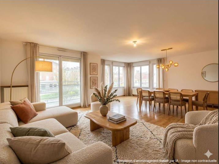 Idéalement situé en plein c?ur de Valenciennes, cet appartement spacieux de 94 m² offre un cadre de vie agréable et pratique, à proximité immédiate des commerces, transports et commodités.