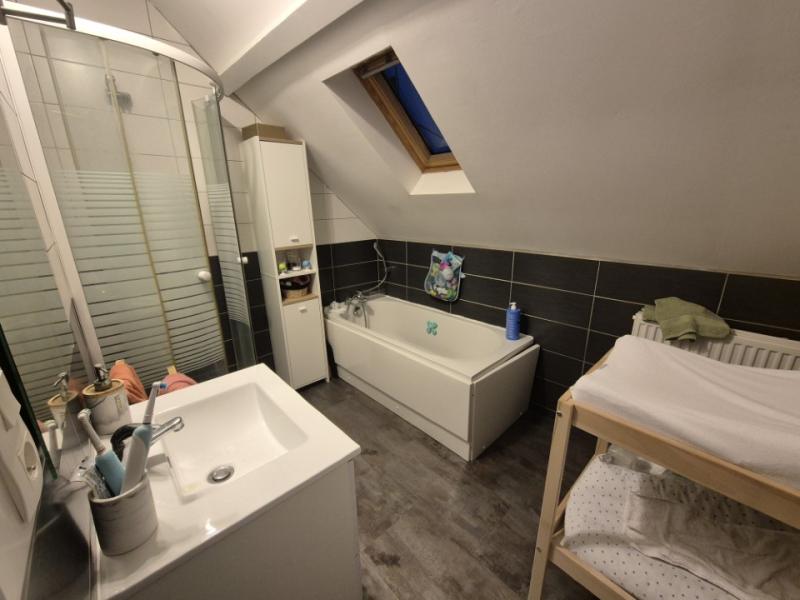 A l'étage : salle de bains (baignoire et douche), 2 chambres.
