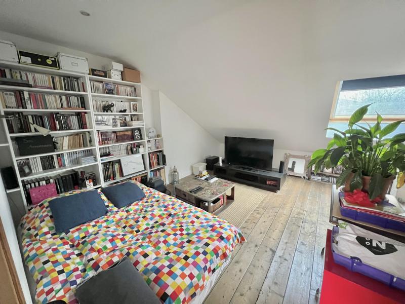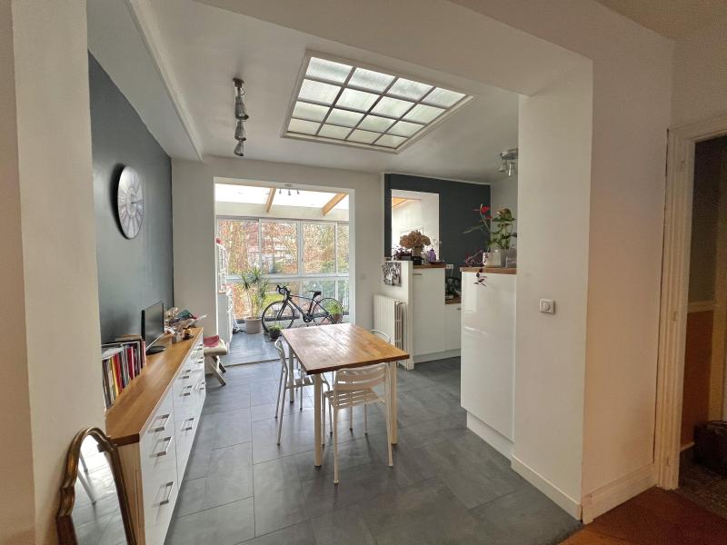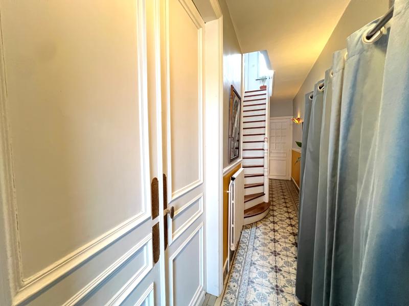 Entrée avec carreaux anciens double porte moulurés; salon/séjour traversant parquet chevron moulures; cuisine équipée moderne et lumineuse ouverte sur jardin d'hiver ; wc; 1er étage : 2 chambre avec parquet d'origine, salle de douche avec wc; au 2 ème étage bel espace de vie sous combles aménagés, lumineux avec parquet et rangement coin nuit (possible deux chambres passantes); cave; jardin