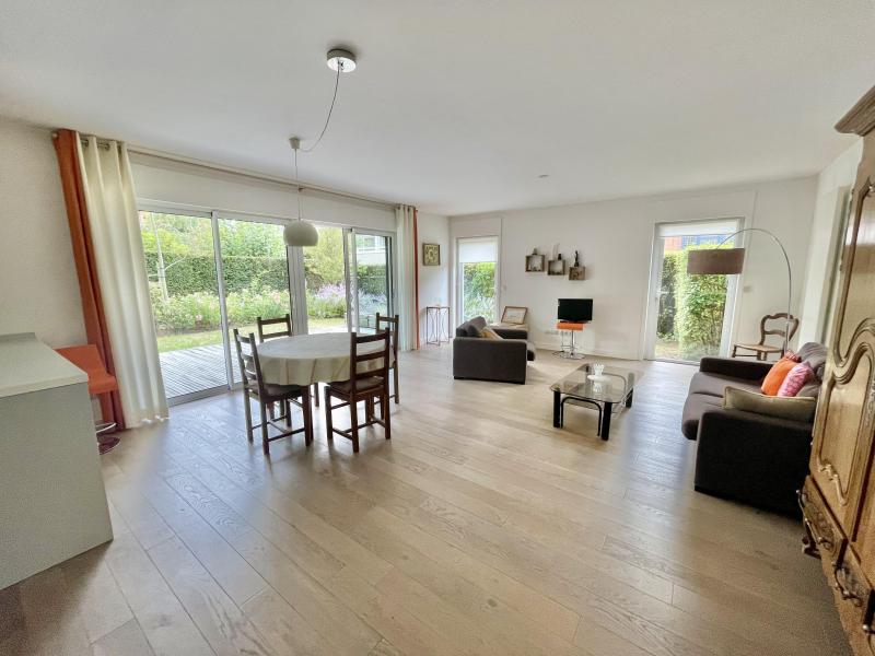 Le séjour de 35 m² et la cuisine ouverte donnent sur une terrasse de 27 m² et un jardin privatif. 3 chambres, SDB, SDD et WC. Garage box fermé au sous-sol. Belles prestations: parquet massif, persiennes électriques, chauffage électrique 'double flux', abords particulièrement soignés. Calme et verdure à proximité de tout! NOUVEAUTE