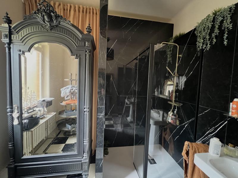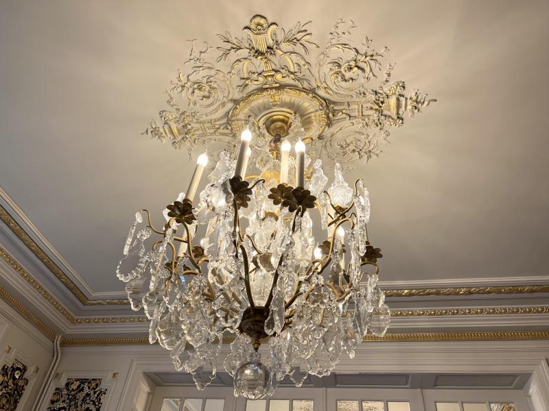 Hall d?entrée majestueux avec mosaïques au sol et vitraux d?époque; Vaste salon-salle à manger doté de superbes parquets, cheminées d?époque, plafonds moulurés dorés à l?or fin et trumeaux élégants; Second salon (ou chambre selon besoin); Bureau lumineux; Cuisine et arrière-cuisine; Salle de bains et WC