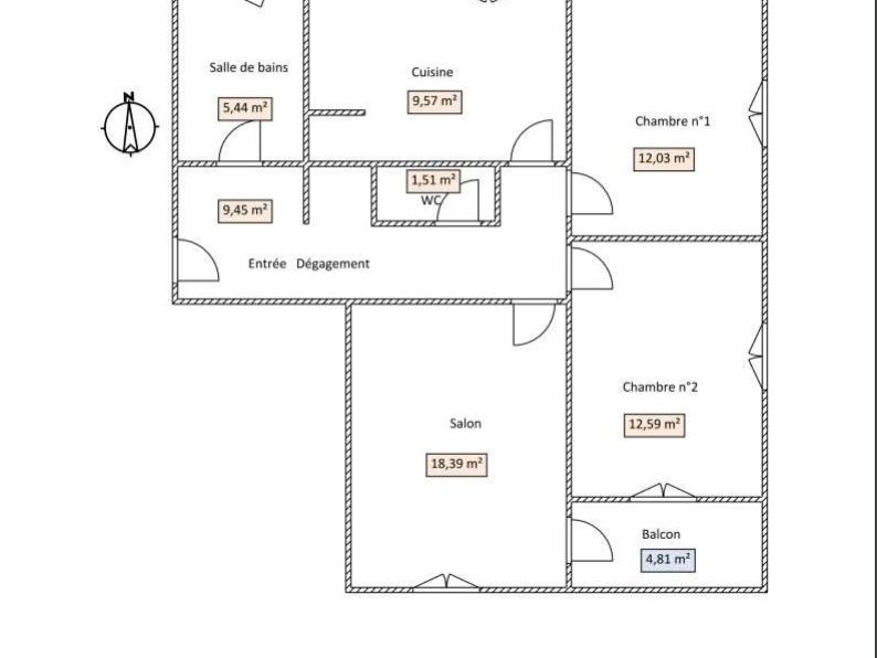 Il se compose d'un séjour de 18m², d'un cuisine de 9,57m², d'une salle de bain de 5,44m², d'une entrée de 9,45m², de deux chambres de 12,03m² et 12,59m², d'un WC séparé de 1,51m² ainsi que d'un balcon de 4,81m².
